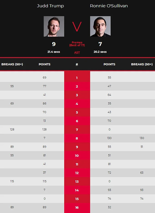 几小时休整后下半场开始,第9局比赛中,特鲁姆普失误罚分,奥沙利文随后长台失误漏球,特鲁姆普上手打出单杆89分完成超分拿下这局,总分6-3扩大优势。第10局中特鲁姆普长台上手拿下55分,随后长台再度上手取得81-0超分优势,奥沙利文依旧是在被超分下没有直接放弃,上手练球打出51分,特鲁姆普拿下这局后7-3扩大优势。