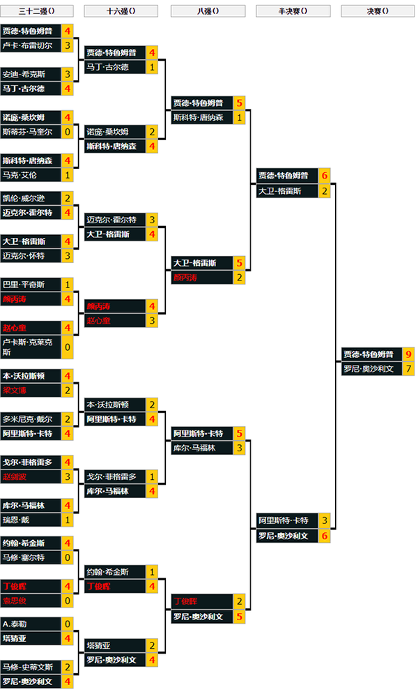 第13局中特鲁姆普上手打出单杆115分本场第二杆破百,总分8-5率先来到赛点,第14局中奥沙利文打出单杆93分挽救赛点,第15局又打出单杆74分制胜,连救两个赛点总分7-8落后一局。第16局中,奥沙利文有机会将比赛带入到决胜局,围球连得32分后打丢中袋进攻,特鲁姆普随后一杆89分制胜,总分9-7击败奥沙利文夺得冠军奖杯。特鲁姆普晋级之路: