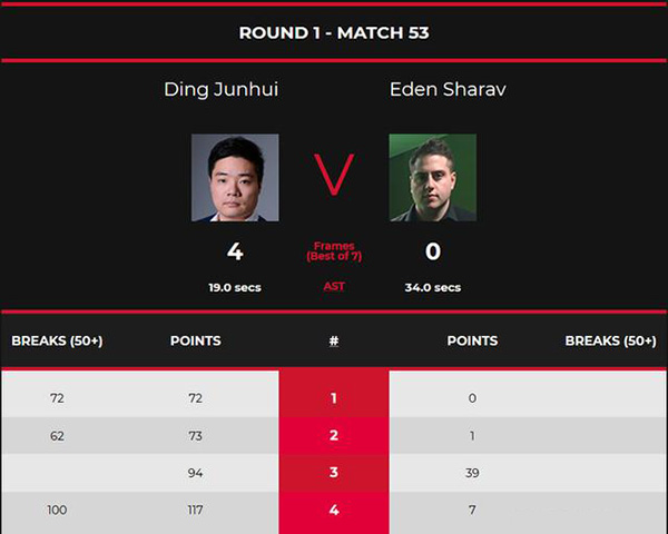 本届比赛首轮比赛为7局4胜制。丁俊晖与沙拉夫此前从未交过手。这场比赛,丁俊晖发挥相对正常,而沙拉夫则是出现了一些低级失误,从而很快就连输4局落败。