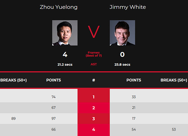 首局比赛就陷入长时间缠斗,两人连续错失围球机会,怀特两度上手都没能连续得分,此后周跃龙开始逐渐拉大分差,74-33超分胜出这局1-0领先。第2局中节奏依旧非常缓慢,周跃龙零敲碎打建立优势,67-21再胜一局来到2-0领先。第3局怀特围球再一次中断在17分,随后周跃龙打出一杆89分制胜3-0来到赛点,第4局怀特非常有机会扳回一局,但围球连得53分没能实现超分,此后周跃龙开始压制对手,不断拼球上手围球66-54逆转胜出这局,总分4-0获胜挺进北爱赛次轮。