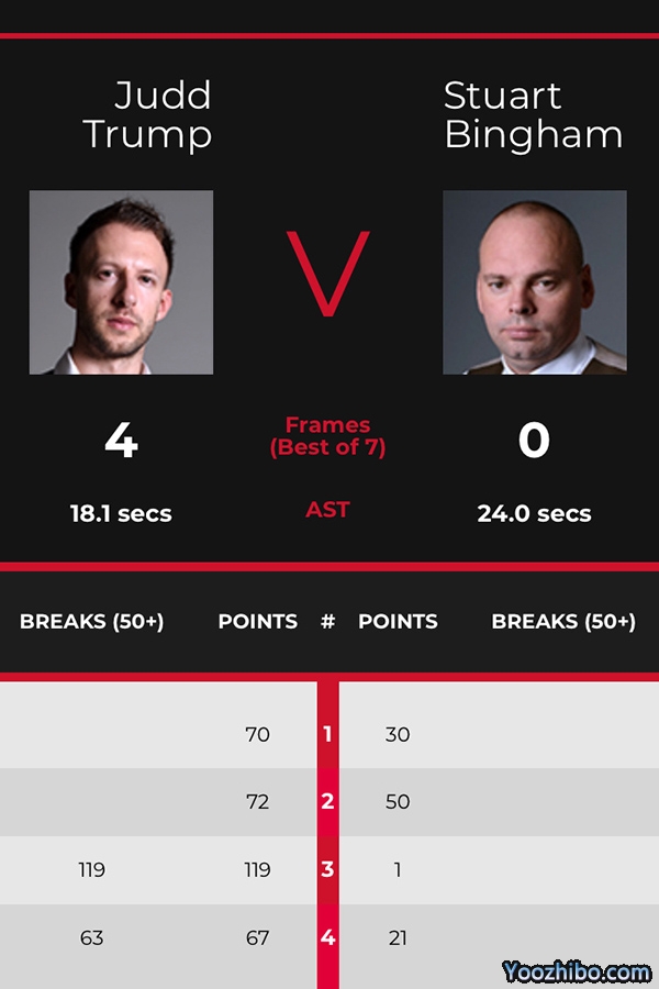 双方前3局争夺,特鲁姆普占尽优势,首局单杆31分豪取开门红,次局0-34落后上演疯狂逆转72-50再下一城,第3局更是狂轰单杆119分暴击对手夺得赛点。宾汉姆生死战一度21-0领先,但在进攻红球时不慎母球摔袋,被罚4分并让出球权。特鲁姆普单杆63分致胜杀死比赛,总比分4-0横扫对手进8强,有望冲击冠中冠首冠。手感冰凉的宾汉姆成为继58岁老将吉米-怀特后,本届赛事第2位被剃光头出局的球手。2020年冠中冠,看来对高龄球员很不友好啊!
