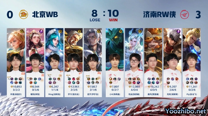 10分30秒,济南RW侠收下暗影暴君。12分40秒,济南RW侠收下暗影主宰,但北京WB乔兮(曾庆龙)黄忠完成二连击破,北京WB最终完成2换3。14分50秒,双方在暗影暴君处持续拉扯消耗状态,北京WB造成对方两人减员,但济南RW侠控到暗影暴君。16分20秒,济南RW侠先消耗对方状态,持续追击击杀对方四人,又在高地击杀杨玉环,济南RW侠一波破掉水晶,拿下本场比赛的胜利!
