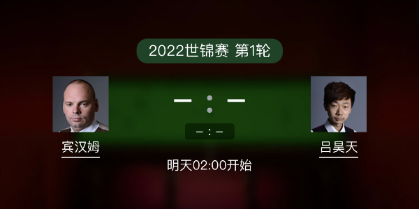 斯诺克世锦赛第1轮下:04月19日 21:30 宾汉姆vs吕昊天