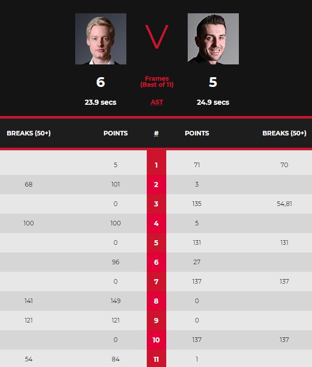 第6局,尼尔·罗伯逊以96-27的比分获胜,将比分改写成3-3,这是双方本场比赛第3次战平。接下来两人的对决极为精彩而且比赛激烈程度也进入白炽化。