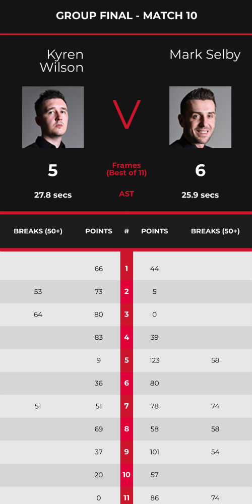 第十一局,塞尔比凭借单杆74分的表现拿下此局比赛的胜利从而以6-5击败威尔逊跻身四强,他将与罗伯逊争夺最终的决赛席位。