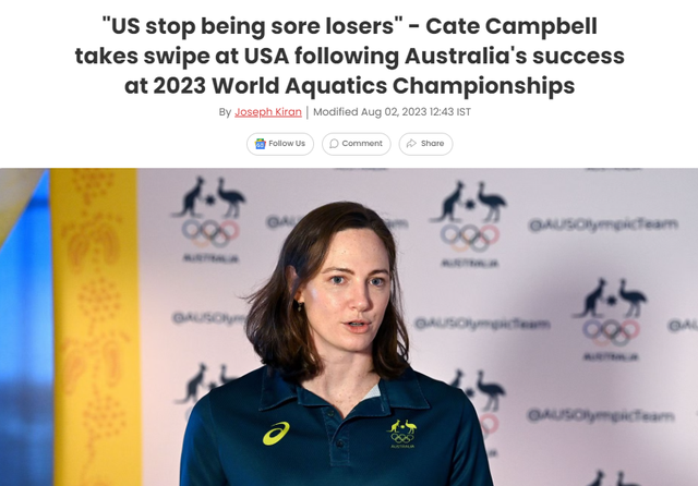 坎贝尔是澳大利亚游泳名将,曾打破100米自由泳世界纪录,并在2016年里约和2021年东京奥运会上两度帮助澳大利亚游泳接力队拿到金牌。东京奥运会之后,坎贝尔一直休养到去年9月。本届世锦赛,坎贝尔也没有参加。不过此前NBC在直播中按照奖牌数进行排名的操作,激怒了坎贝尔。坎贝尔公开讽刺:“美国人真的是真的是输不起。”