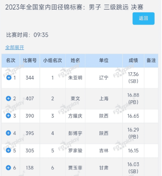 来源:24直播网03-17 16:0624直播网03月16日讯全国室内田径锦标赛继续进行,男子三级跳远落下帷幕,最终辽宁选手朱亚明第三跳17米36,成功夺得冠军。这位东京奥运会银牌、世锦赛铜牌获得者表现强势,创造PB。亚军属于来自上海的粟文,他跳出了16米88,也创个人PB。第三名属于陕西的方耀庆,他的成绩是16米65。