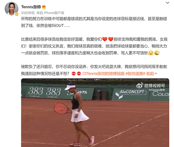 比赛结束之后,张帅在社交媒体上晒出了被误判的时刻,她表示所有的努力在训练中可能都是错误的尤其是当你设定的击球目标是接近线,甚至是触碰到了线、依然会被叫OUT。同时张帅还直言:“被欺负了还只能忍,你不忍说你没涵养,你发火吧说耍大牌,我就想问问民间高手教教我遇到这种情况怒还是不怒?”