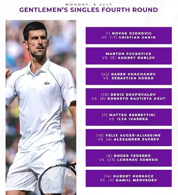 2021温网八场男单1/8决赛对阵如下:上半区,小德VS加林,卢布列夫VS福索维茨,卡恰诺夫VS柯达,阿古特VS沙波瓦洛夫;下半区,贝雷蒂尼VS伊瓦什卡,小兹维列夫VS阿利亚西姆,费德勒VS索内戈,梅德维德夫VS胡尔卡奇。