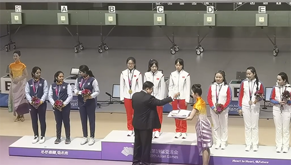 比赛结束之后的颁奖仪式,中国射击传奇王义夫亲自颁奖,参加过6届奥运会的王义夫已经63岁了,他也曾经在亚运会夺得过金牌,如今给三位中国队的小将颁奖,也是一种传承。