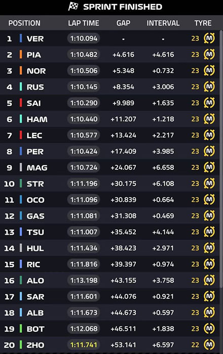 24直播网讯 北京时间06月29日,F1奥地利站冲刺赛结束争夺,维斯塔潘夺冠,迈凯伦包揽2、3名,周冠宇垫底。