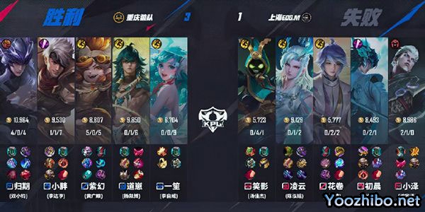 第二局,10分钟才爆发一血,10分钟前塔和龙的资源优势都在EDGM手里;就10分钟那波开始,EDGM找到机会击杀紫幻的海诺;狼队这边的关羽进场只要没有瞬间秒掉EDGM的C位就会被反打;最后15分钟龙团虽然狼队拿到了龙但被团灭,上海EDGM扳平比分!本局MVP为上海EDGM-花卷 (吴育涛)沈梦溪!