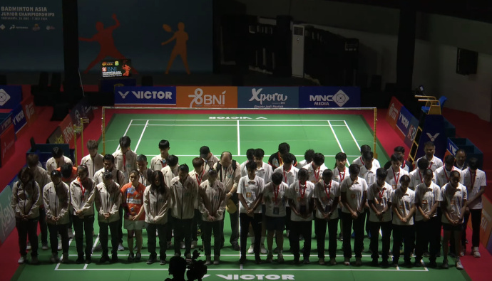 24直播网讯 北京时间7月1日,在今日羽毛球亚青赛团体赛开赛前,亚羽联组织所有在场人员,为不幸离世的国羽17岁男单小将张志杰默哀。