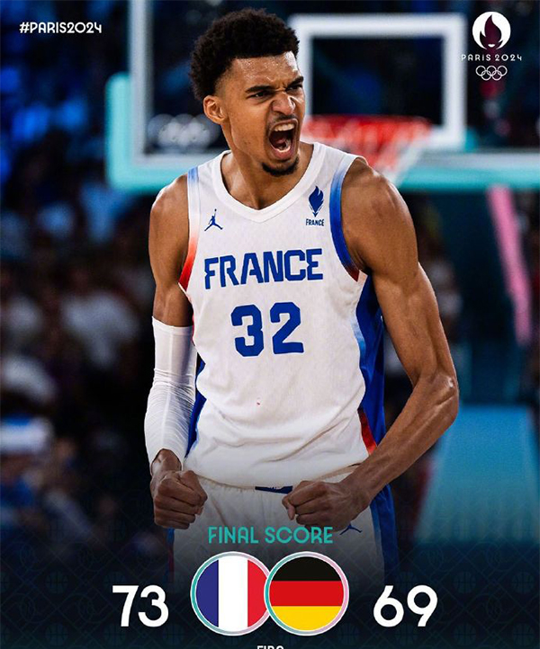 24直播网8月9日讯 奥运会男篮进入半决赛争夺,东道主法国迎战世界杯冠军德国男篮。两支同为B组的球队已经有过一次对决,当时德国男篮14分的优势击败法国男篮。首节开局德国男篮打出灵活的进攻,施罗德和小瓦格纳各自命中三分带队送出12-2的攻势抢占先机;法国在暂停回来后逐渐找到状态,但外线失准成为限制他们的关键,整个上半场他们三分球12投1中让局面很被动。不过好在他们防守端在线并成功遏制住德国男篮核心之一的施罗德,而整个第二节他们仅丢8分表现堪称完美,他们以此为基础在一度落后10分的情况下送出15-5的攻势扳平比分结束上半场。休息归来巴图姆的三分帮助法国男篮取得本场第一次领先,而他们三分手感稍稍回暖也帮助他们占据上风,末节文班亚马也在外线命中三分,士气大涨的法国10-3开局将优势扩大至两位数;顽强的德国在读秒阶段追至2分看到希望,不过德国最后时刻出现致命失误让出了绝平甚至绝杀球权,法国则在罚球大战中守住胜利。最终,法国男篮73-69力克德国男篮率先杀入决赛。