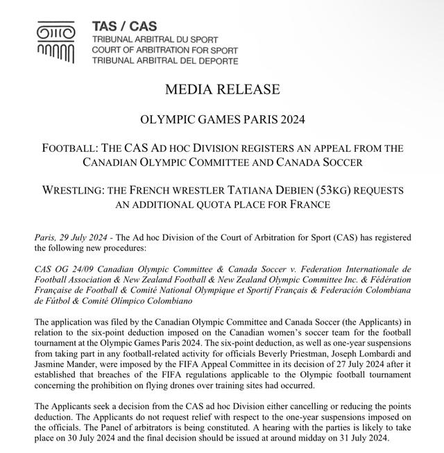 根据国际体育仲裁法庭文件,加拿大女足对6分的处罚提出了上诉。文件指出,加拿大足协要求取消或减少扣除的积分,但不要求对教练减少停赛。该上诉将在7月31日作出判决。