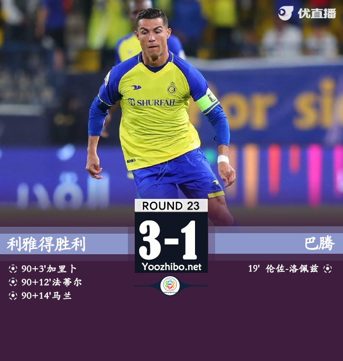 24直播网讯 北京时间3月4日凌晨1:30,沙特联赛第19轮。利雅得胜利对阵巴腾。上半场,伦佐头球破门为巴腾取得领先,C罗空门机会遭门线解围;下半场,加里卜、法蒂尔、马兰在补时阶段连入三球帮助利雅得胜利完成逆转。全场比赛结束,利雅得胜利3-1巴腾!