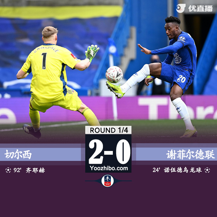 24直播网3月21日讯 北京时间今天21:30,足总杯1/4决赛切尔西在斯坦福桥球场迎战谢菲联的比赛准时开始。上半场奇尔维尔远射造成诺伍德乌龙,半场切尔西暂时一球领先。下半场终场前齐耶赫破门,全场结束切尔西2-0击败谢菲联晋级。