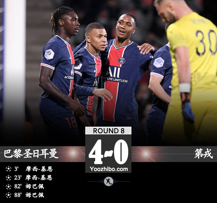 24直播网讯:北京时间10月25日凌晨3时,2020-2021赛季法甲第8轮继续进行角逐,巴黎圣日耳曼主场迎战第戎。上半时,巴克助攻摩西-基恩首开纪录,随后摩西-基恩接内马尔妙传破门梅开二度;下半时,姆巴佩替补双响为巴黎锁定胜局。全场比赛结束,巴黎主场4-0击败第戎豪夺联赛6连胜。