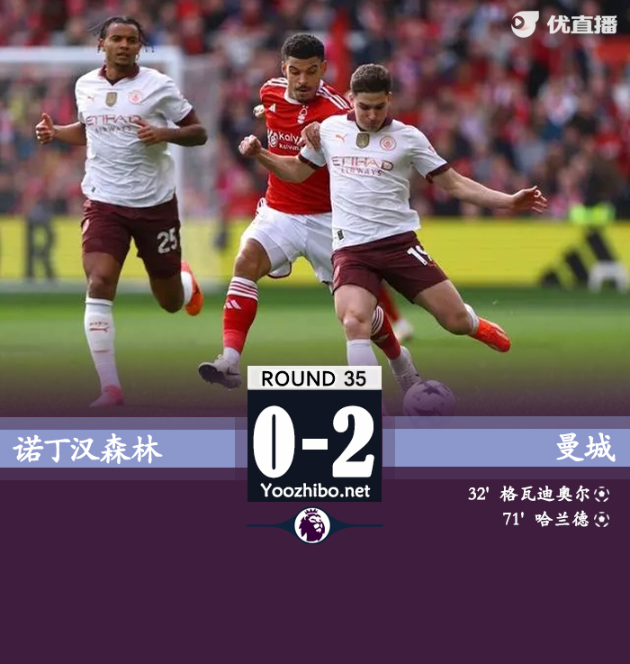 24直播网讯:北京时间4月28日23:30,英超第35轮,曼城客战诺丁汉森林。上半场,德布劳内角球助攻,格瓦迪奥尔头球破门,伍德错失良机;下半场,格瓦迪奥尔门前送出关键解围,哈兰德伤愈复出替补登场打入一球。最终,曼城客场2-0击败诺丁汉森林,积79分位列积分榜第二位,少赛一场落后榜首的阿森纳1分,森林则积26分高出降级区1分。