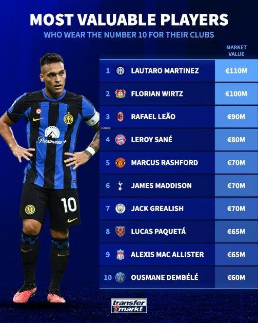 德转列现役10号球员身价Top10:劳塔罗1.1亿欧居首 维尔茨第二