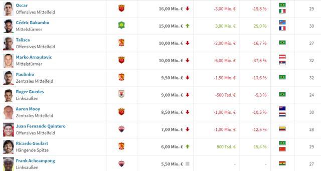 德转中超球员身价排行:奥斯卡第一,巴坎布第二