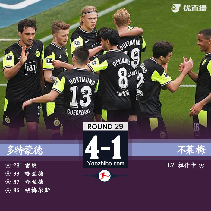 多特蒙德4-1不莱梅 哈兰德双响雷纳世界波