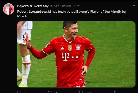 24直播网讯北京时间4月17日,拜仁官方宣布,莱万多夫斯基当选拜仁三月最佳球员。