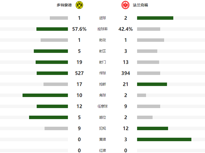 全场比赛结束,多特1-2不敌法兰克福,遭遇两轮不胜。