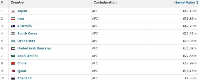 德转本期亚洲男足身价排行: 日本第一, 中国第八