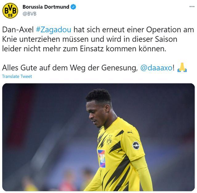 24直播网3月26日讯 据多特蒙德官方消息,球队21岁后卫扎加杜膝盖受伤,赛季提前报销。