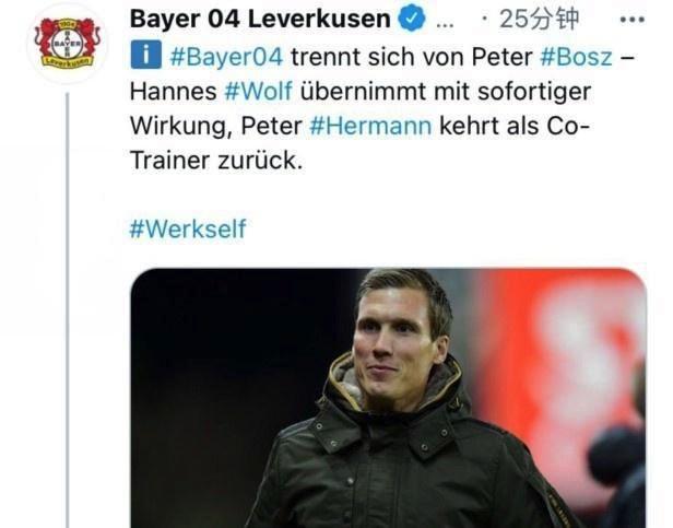 来源:24直播网03-23 19:5124直播网3月23日讯 ,德甲老牌劲旅勒沃库森俱乐部官方宣布解雇球队的荷兰籍主帅博斯,同时离开的还有他的两名助教和体能教练。而在解雇博斯的同时,勒沃库森也确定了球队的新任主帅,那就是德国U18男足的少帅沃尔夫,39岁的他将会执教勒沃库森至本赛季结束,此前沃尔夫曾在德国足协任职,并且执教过斯图加特、汉堡和根克队。此外俱乐部前球员和前主帅彼得-赫尔曼,将担任助教。