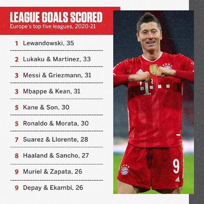 莱万有多强?单人联赛进球数超五大联赛所有二人组!