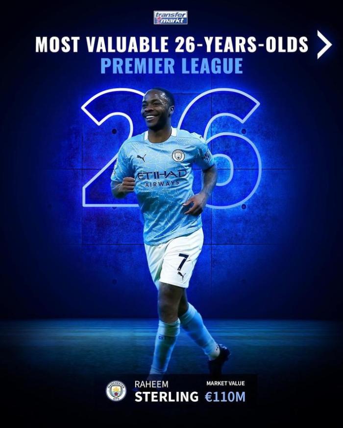 五大联赛26岁最高身价球员: 斯特林1.1亿居首