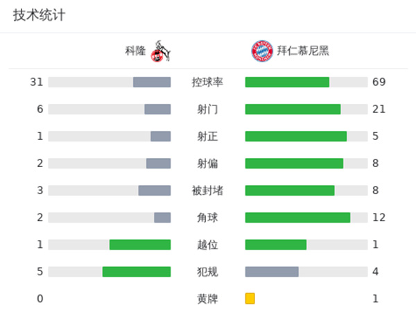 拜仁1-0科隆 凯恩破门12轮18球+多次威胁长传