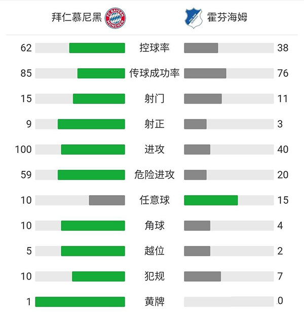 第44分钟,霍村扳回一城,一次前场反击,比博左路拿球,横传禁区内,克拉马里奇端射得手。拜仁慕尼黑2-1霍芬海姆。
