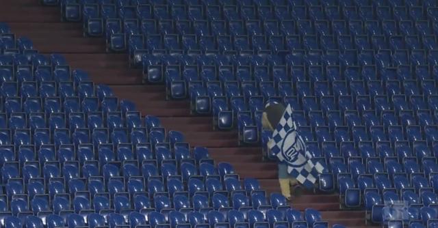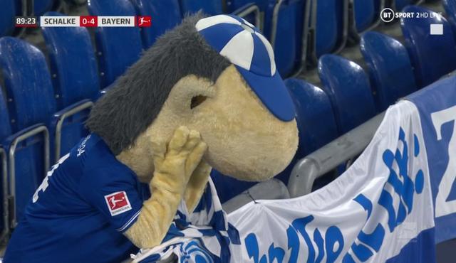 在今天对阵拜仁的比赛中,在阿拉巴打入第四球后,转播镜头给到了沙尔克04的吉祥物,他一人坐在看台上痛苦掩面,与空荡的球场结合之下,看起来尤为落寞。