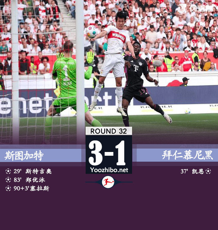 第82分钟,斯图加特反超比分!塞拉斯左路传到禁区后点郑优泳头球破门,斯图加特2-1拜仁。