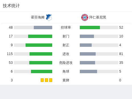 第85分钟,禁区内比绍夫回做,克拉马里奇低射得手,霍芬海姆3-2拜仁。