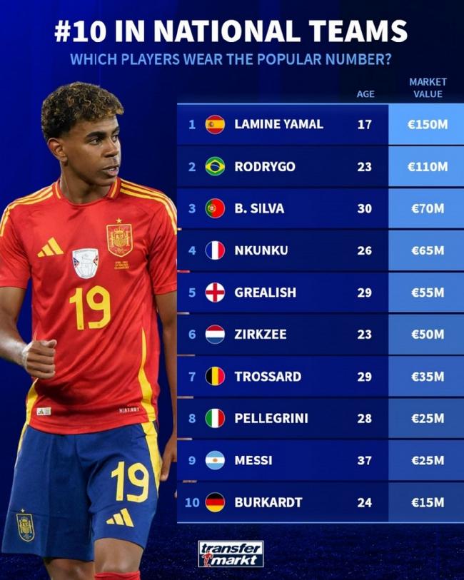 德转统计国家队10号球员身价,亚马尔1.5亿欧居首