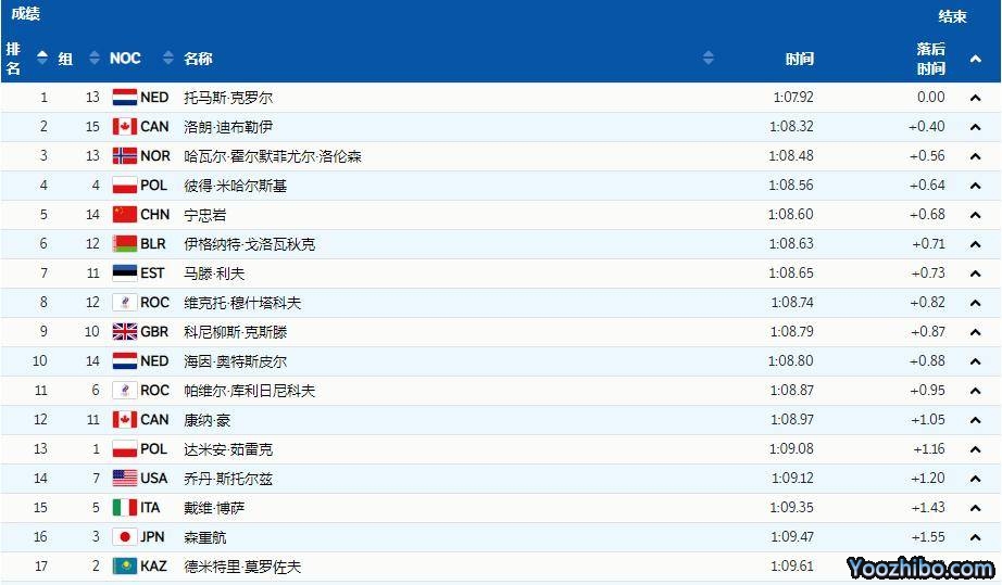 最终,廉子文滑出了1分09秒93的成绩排名第19,宁忠岩滑出了1分08秒60的成绩排名第5。