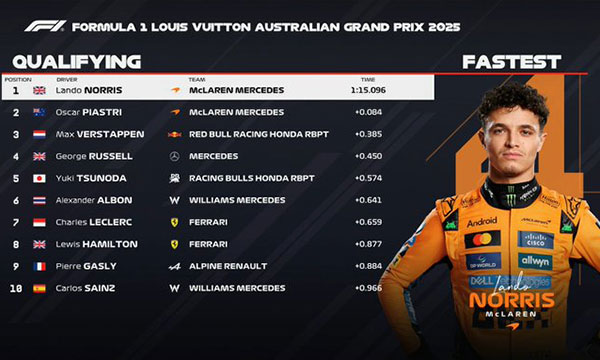 - 【录像】[腾讯]2025F1澳大利亚大奖赛排位赛 圈速2025-03-15 16:20:43