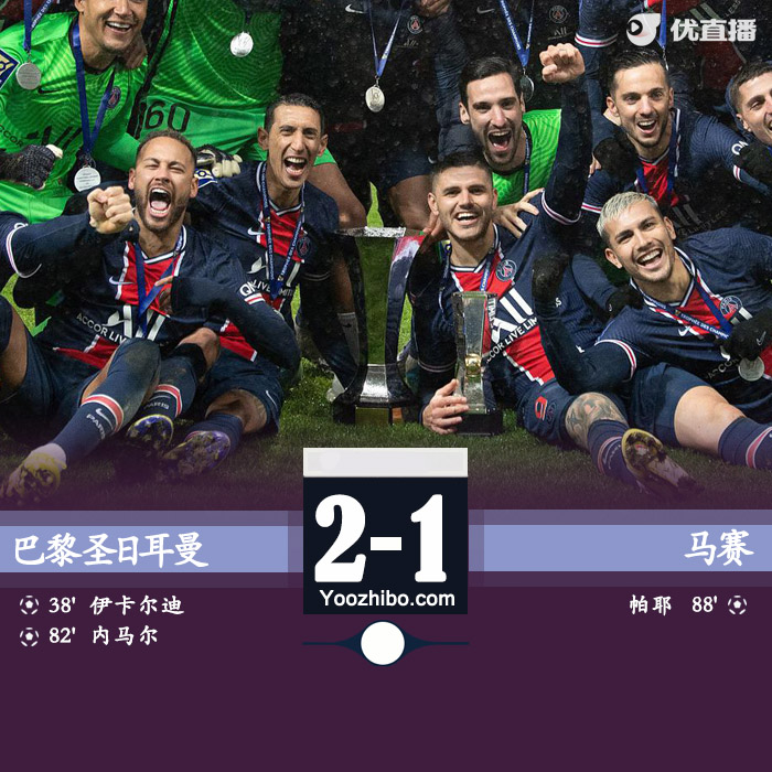 24直播网1月14日讯 北京时间1月14日4:00,法国超级杯决赛打响,巴黎圣日尔曼迎战马赛。上半场,伊卡尔迪、姆巴佩接连越位进球被吹,伊卡尔迪打破僵局后又击中横梁。下半场,内马尔复出登场点球建功,帕耶扳回一球。全场比赛结束,巴黎2-1战胜马赛,连续八年夺得法国超级杯。