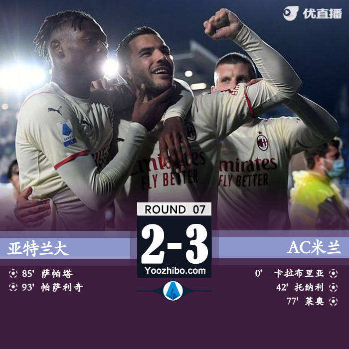 24直播网10月4日讯 北京时间10月04日星期一02:45,意甲第7轮亚特兰大对阵AC米兰。上半场,卡拉布里亚开场28秒超级闪击,托纳利破门,迈尼昂频频救险,AC米兰半场2-0领先亚特兰大。下半场,特奥奔袭助攻,莱奥破门,梅西亚斯手球被判罚点球,萨帕塔点射扳回一城,帕萨利奇补时再入一球。最终,AC米兰客场3-2战胜亚特兰大,红黑军团升至联赛第二。