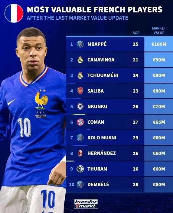 24直播网讯 法国球员身价榜公布,巴黎圣日耳曼头号球星姆巴佩以1.8亿领跑,卡马文加排在第二。