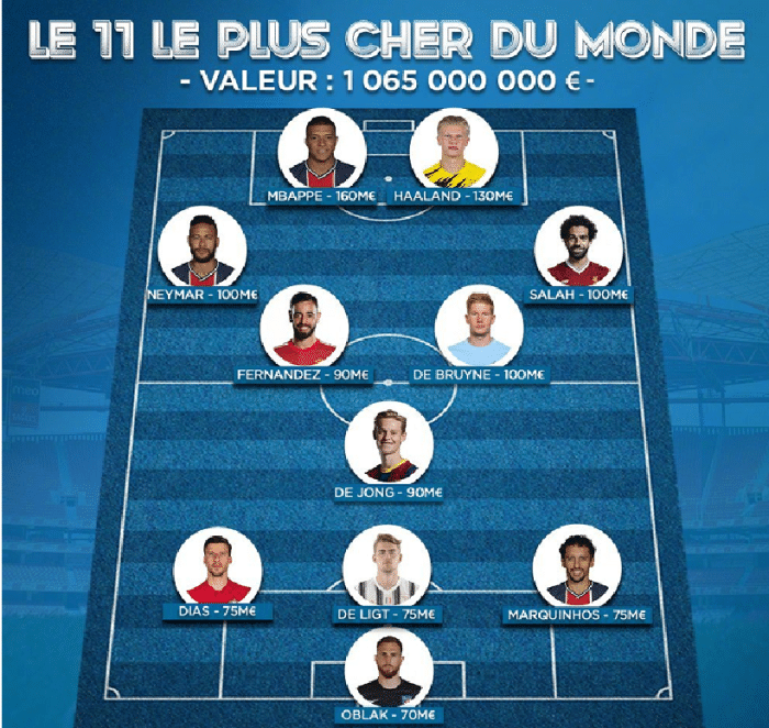 如图,这是一个352阵容,门将位置上是身价7000万欧元的奥布拉克,后防线上三个人的身价都是7500万欧元,分别是曼城的迪亚斯,尤文的德里赫特和巴黎的马尔金尼奥斯。中场方面分别是身价9000万欧元的德容,身价1亿欧元的德布劳内,身价9000万欧元的B费,身价1亿欧元的内马尔和身价1亿欧元的萨拉赫。而前锋组合是身价1.6亿欧元的姆巴佩和身价1.3亿欧元的哈兰德。
