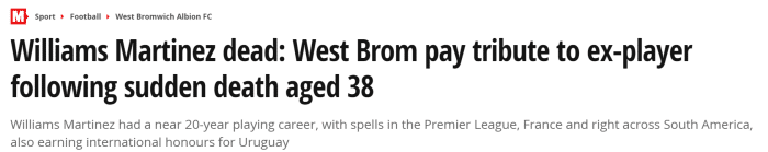 来源:24直播网07-19 17:2524直播网讯 据《镜报》报道,前西布朗球星、前乌拉圭国脚威廉姆斯-马丁内斯上周末自杀身亡,年仅38岁。