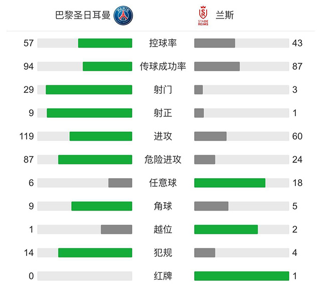 全场比赛结束,巴黎圣日耳曼4-0兰斯。