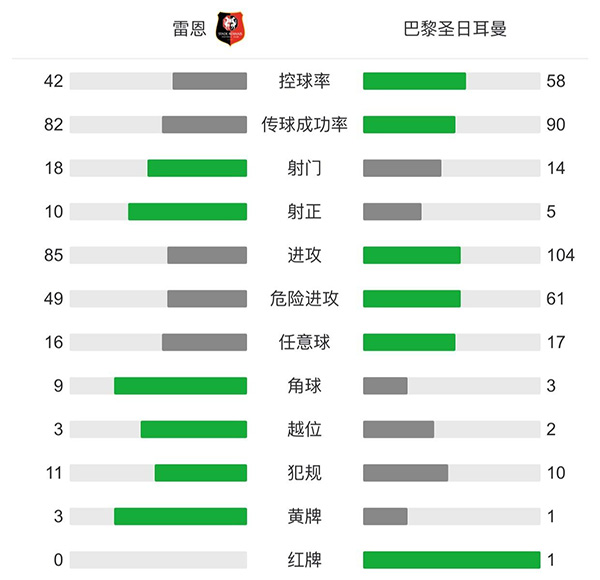 全场比赛结束,巴黎客场1-1雷恩。