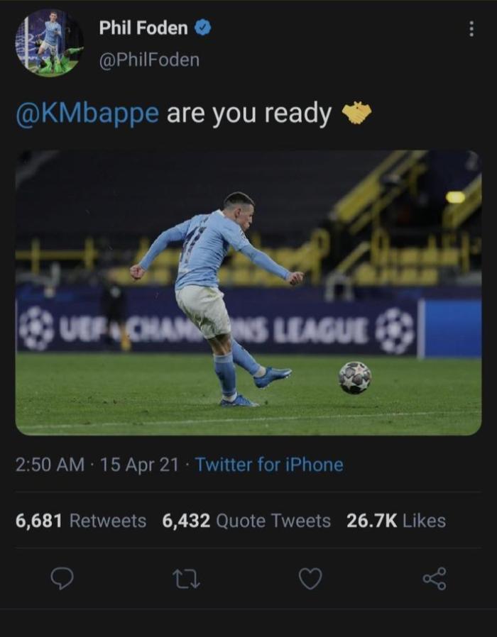 赛后,曼城小将福登在个人社交媒体上@姆巴佩并霸气喊话:你准备好了吗?