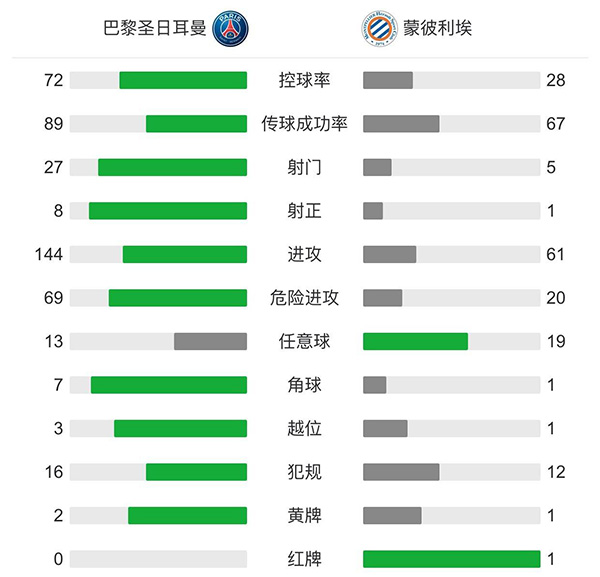 全场比赛结束,巴黎圣日耳曼4-0击败十人蒙彼利埃,继续排在法甲积分榜首。